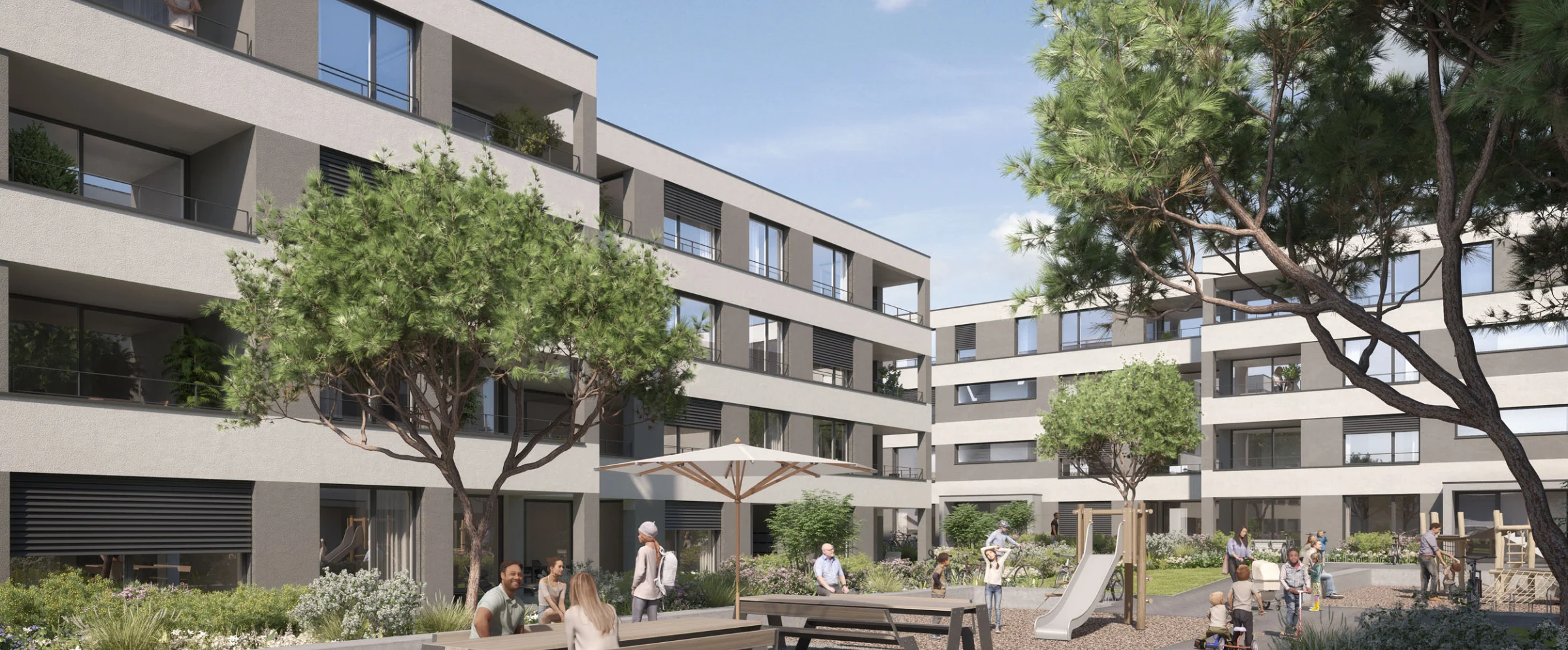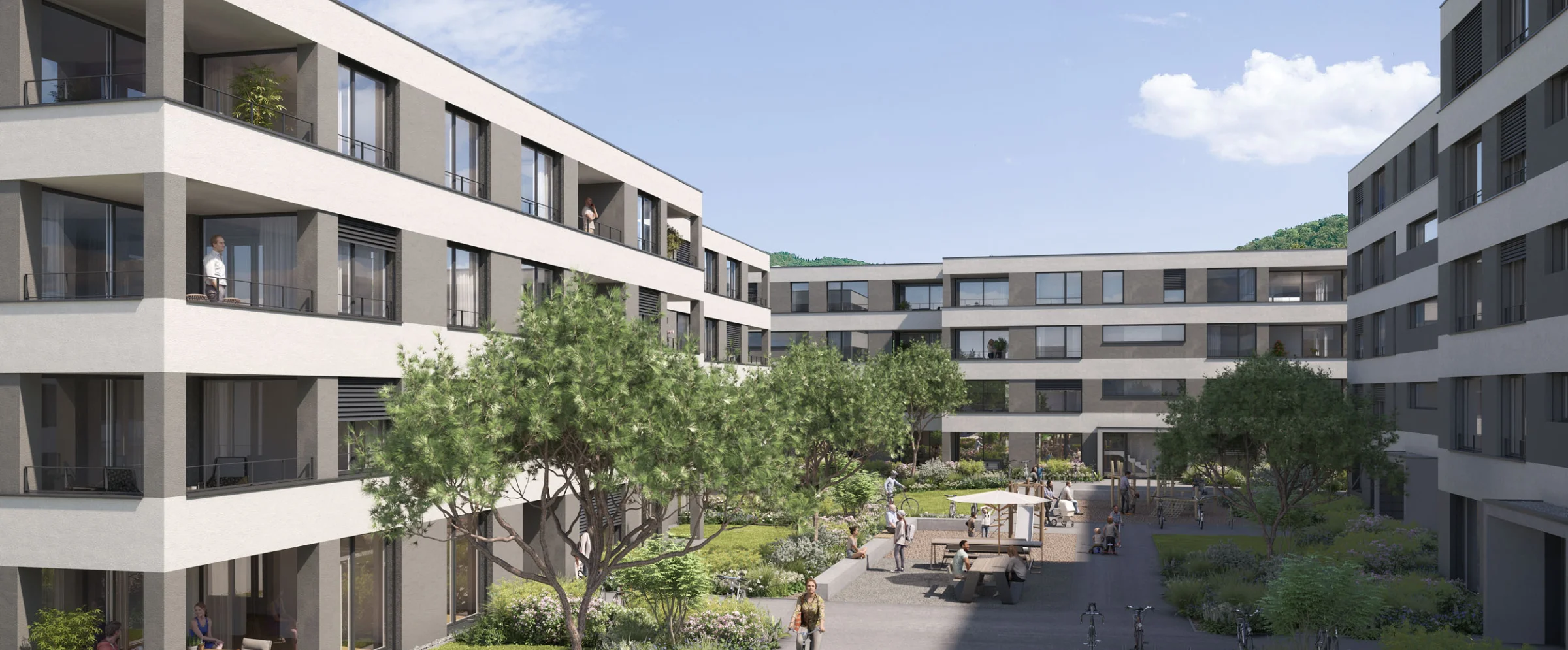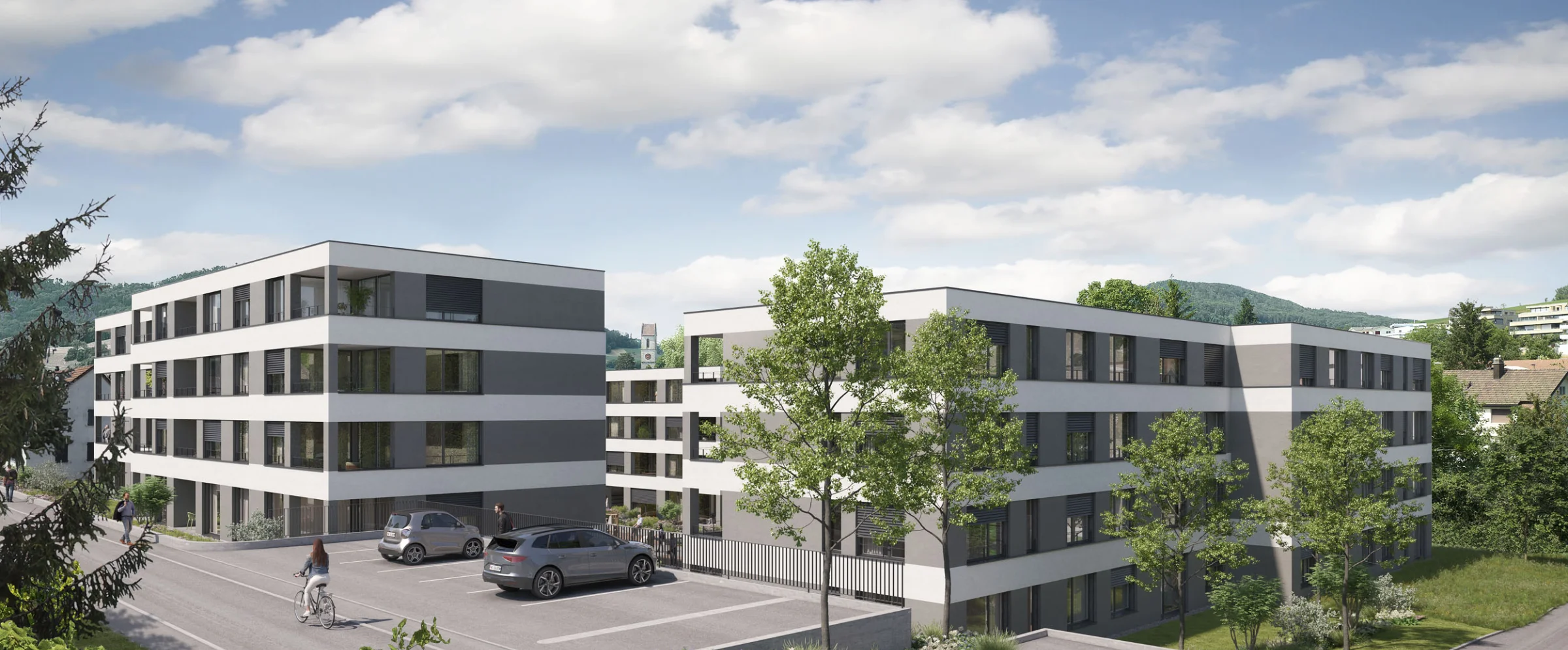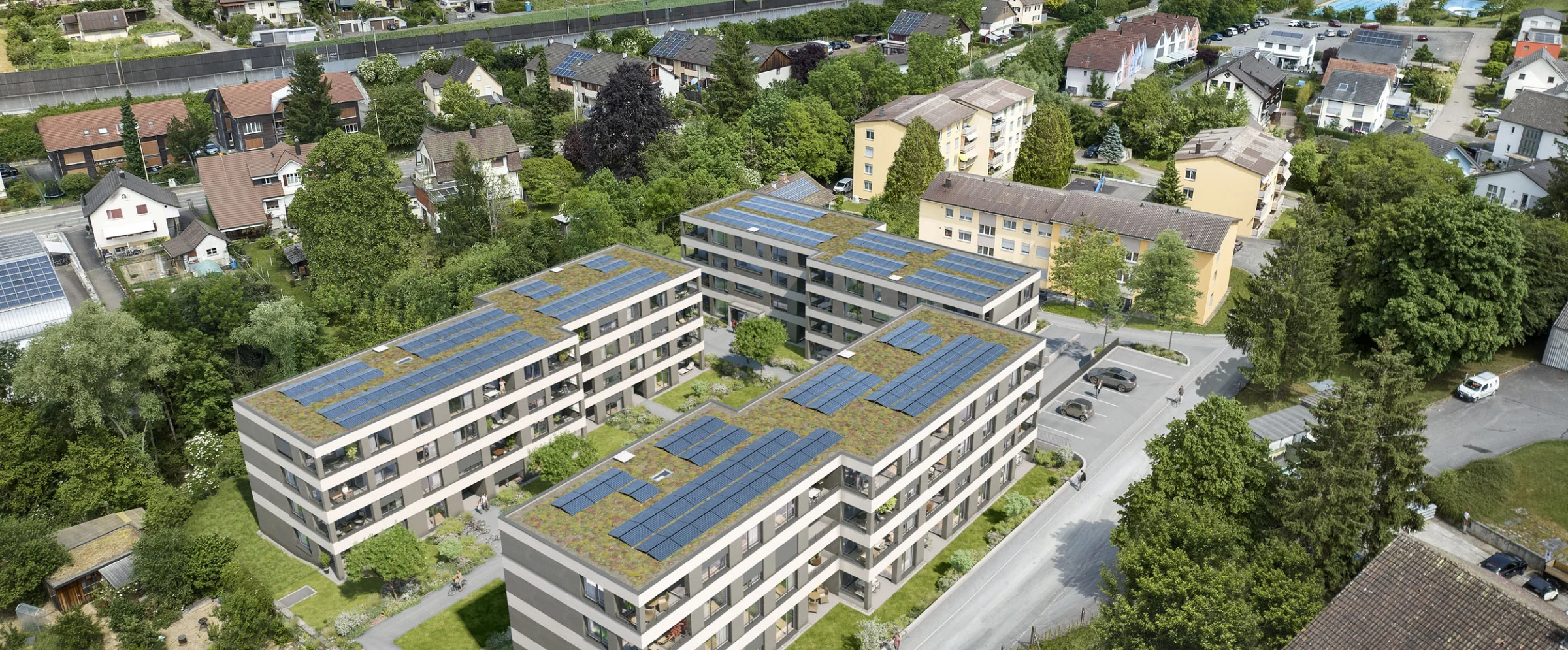 Dank der modernen und schlichten Architektur fügt sich die Überbauung perfekt in das sie umschliessende ruhige Wohnquartier ein. Die Aussenraumgestaltung bietet einen Spielplatz mit Sitzgelegenheiten sowie Veloabstellmöglichkeiten. Die gemeinsame Tiefgarage mit Veloräumen sowie jeweils direktem Zugang zu den Treppenhäusern der Überbauung befindet sich direkt unter der Liegenschaft.
